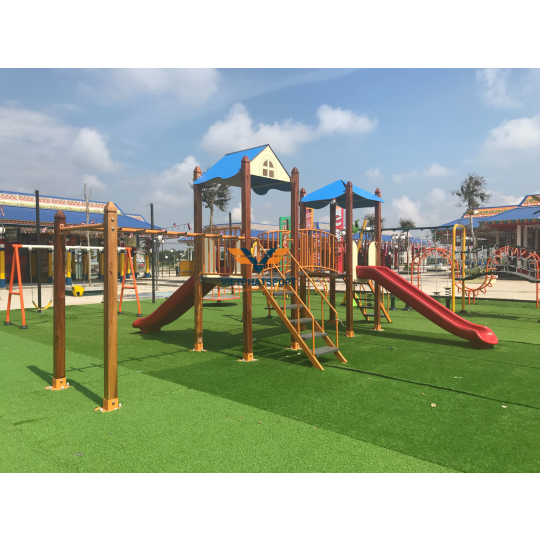 Hình ảnh thực tế sau lắp đặt của Cụm vận động liên hoàn 2 mái che, trụ gỗ NIK703221W