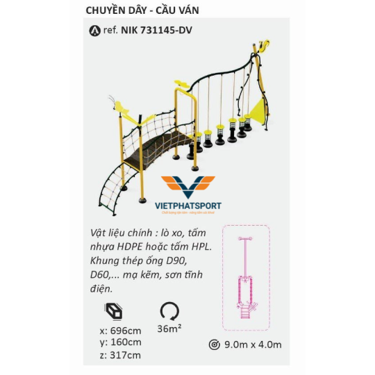 Với thiết kế hiện đại, màu sắc bắt mắt và chất liệu cao cấp, Khung vận động chuyền dây, cầu ván NIK731146-DV là sự lựa chọn hoàn hảo cho các trường học, khu dân cư, công viên, khu vui chơi trẻ em và nhiều không gian công cộng khác. Sản phẩm được cung cấp bởi CÔNG TY CỔ PHẦN THỂ THAO VIỆT PHÁT, một thương hiệu Việt uy tín, đáp ứng các tiêu chuẩn chất lượng quốc tế khắt khe.