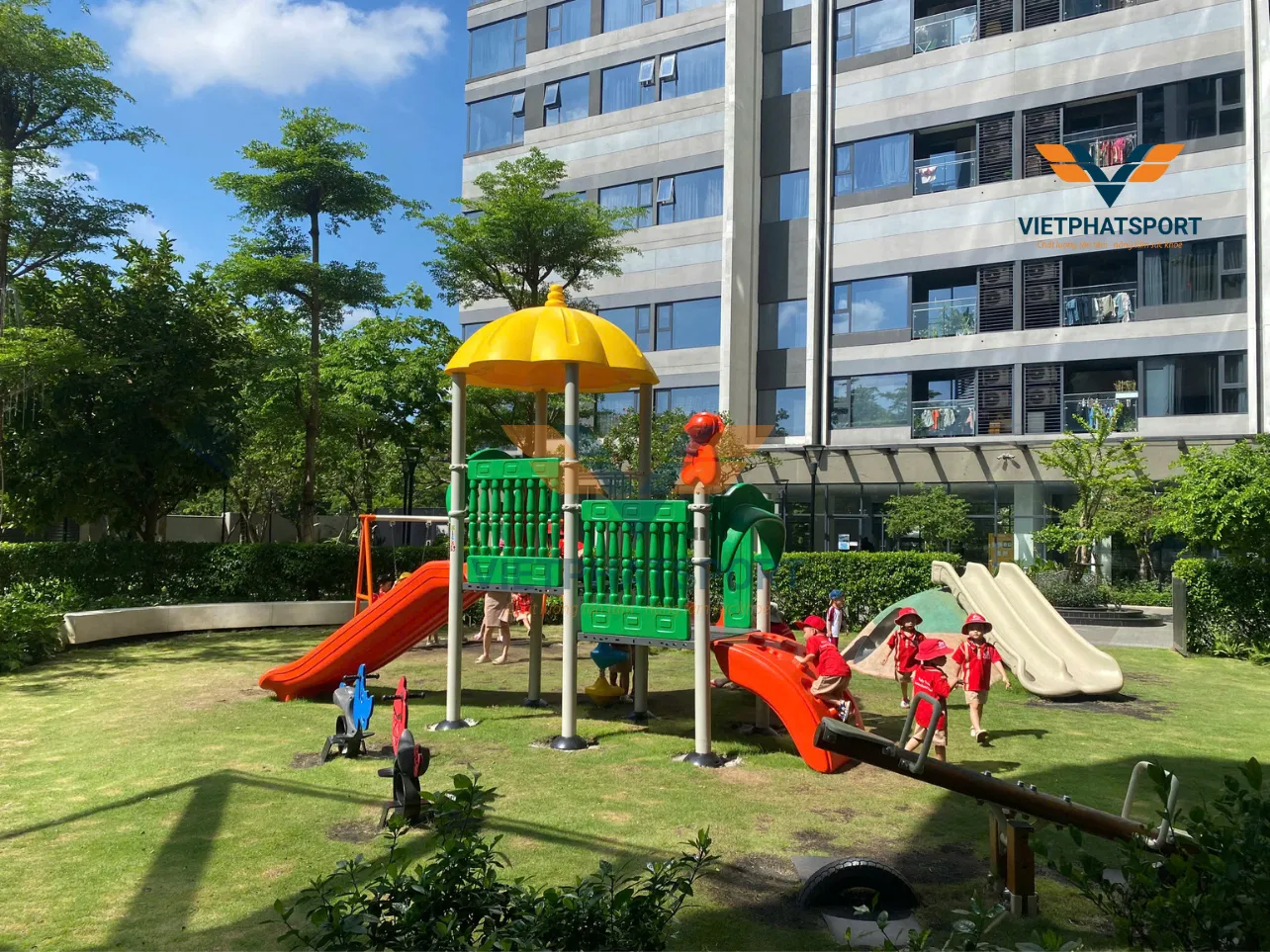 - Thiết bị vận động trẻ em: Cầu trượt, xích đu, bập bênh, nhà liên hoàn.