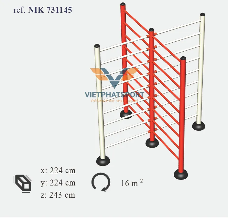 Thang leo chữ X NIK731145 là thiết bị vận động ngoài trời lý tưởng, được thiết kế đặc biệt dành cho trẻ em từ 6 tuổi trở lên. Sản phẩm không chỉ mang đến những giờ phút vui chơi sảng khoái mà còn góp phần phát triển thể chất, rèn luyện sự khéo léo và tăng cường khả năng phối hợp vận động cho trẻ. Sản phẩm được cung cấp bởi CÔNG TY CỔ PHẦN THỂ THAO VIỆT PHÁT, thương hiệu uy tín với nhiều năm kinh nghiệm trong lĩnh vực cung cấp và thi công dụng cụ thể dục thể thao.