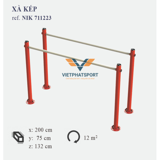 Thiết bị xà kép NIK711223 là sự lựa chọn hoàn hảo cho các trường học, khu dân cư, công viên và nhiều không gian công cộng khác. Được thiết kế theo tiêu chuẩn Châu Âu và sản xuất tại Việt Nam với công nghệ tiên tiến, sản phẩm này không chỉ mang đến trải nghiệm vận động thú vị mà còn đảm bảo an toàn tuyệt đối cho người sử dụng, đặc biệt là trẻ em từ 6 tuổi trở lên. Sản phẩm được cung cấp và thi công bởi CÔNG TY CỔ PHẦN THỂ THAO VIỆT PHÁT, đơn vị hàng đầu trong lĩnh vực cung cấp dụng cụ thể dục thể thao.