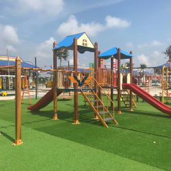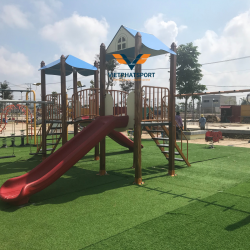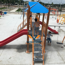 Hình ảnh thực tế của Cụm vận động liên hoàn 2 mái che, trụ gỗ NIK703221W tại Đồng Xoài, Bình Phước