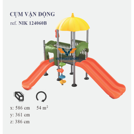 Cụm vận động liên hoàn LLDPE NIK124060B là sản phẩm được thiết kế và sản xuất bởi Công ty Cổ phần Thể thao Việt Phát, mang đến một không gian vui chơi và rèn luyện thể chất an toàn, hấp dẫn cho trẻ em từ 4 tuổi trở lên. Với thiết kế theo tiêu chuẩn Châu Âu và chất liệu cao cấp, sản phẩm không chỉ đảm bảo độ bền bỉ mà còn góp phần phát triển toàn diện các kỹ năng vận động cho trẻ.