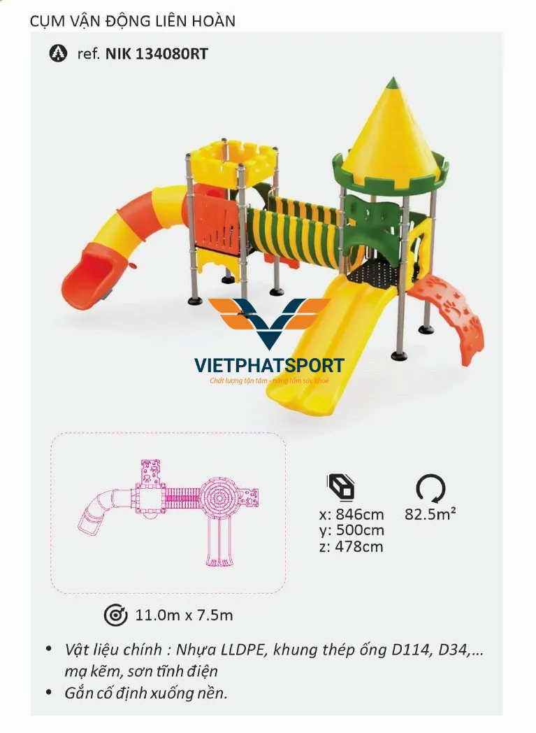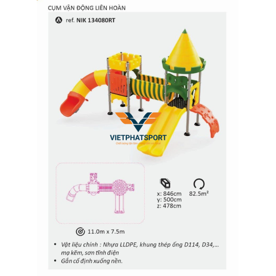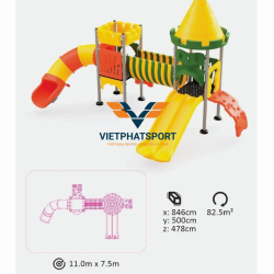 Sản phẩm có kích thước DxRxC là 846x 500 x 478cm, phù hợp với diện tích lắp đặt 11.4 x 7.9m. Cụm vận động liên hoàn có thể phục vụ tối đa 10 trẻ em cùng lúc, với độ tuổi từ 04 trở lên.