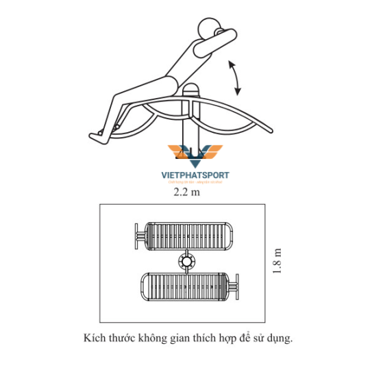 Dụng cụ lưng bụng đôi giá rẻ được thiết kế với kích thước phù hợp (127 x 192 x 64cm), diện tích sử dụng 2.8m x 2m, cho phép 02 người cùng tập luyện một cách thoải mái. Thiết kế này không chỉ tối ưu hóa không gian mà còn tạo điều kiện cho việc tập luyện nhóm, tăng tính tương tác và tạo động lực cho người tập.