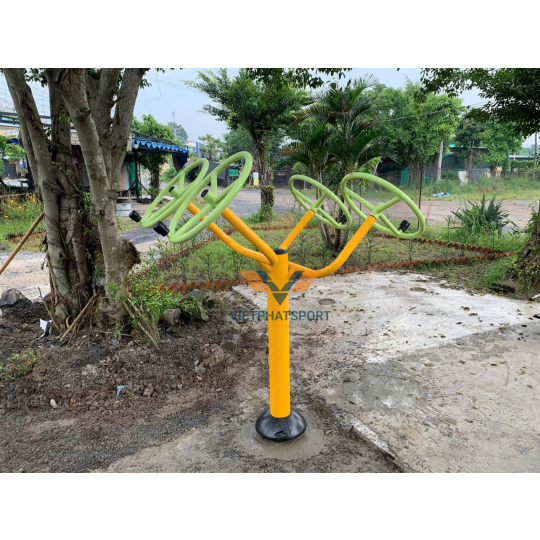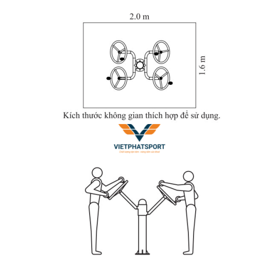 * Tiêu chuẩn an toàn: Sản phẩm đáp ứng đầy đủ tiêu chuẩn Việt Nam về yêu cầu an toàn và phương pháp thử đối với thiết bị tập luyện thể dục ngoài trời được lắp đặt cố định. * Lắp đặt cố định: Dụng cụ được gắn cố định xuống nền, đảm bảo an toàn tuyệt đối trong quá trình sử dụng. * Số người sử dụng: Thiết kế cho phép 02 người cùng tập luyện, tăng tính tương tác và hiệu quả sử dụng. * Kích thước phù hợp: Với diện tích sử dụng 2m x 1.6m và kích thước tổng thể 123 x 104 x 150cm, dụng cụ phù hợp với nhiều không gian lắp đặt khác nhau.