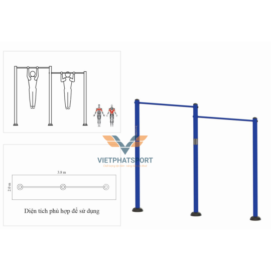 Dụng cụ xà đơn 2 bậc của Việt Phát được thiết kế và sản xuất với tiêu chuẩn chất lượng cao nhất, đảm bảo an toàn và hiệu quả tập luyện cho người sử dụng. Dưới đây là thông số kỹ thuật chi tiết và những ưu điểm nổi bật của sản phẩm: