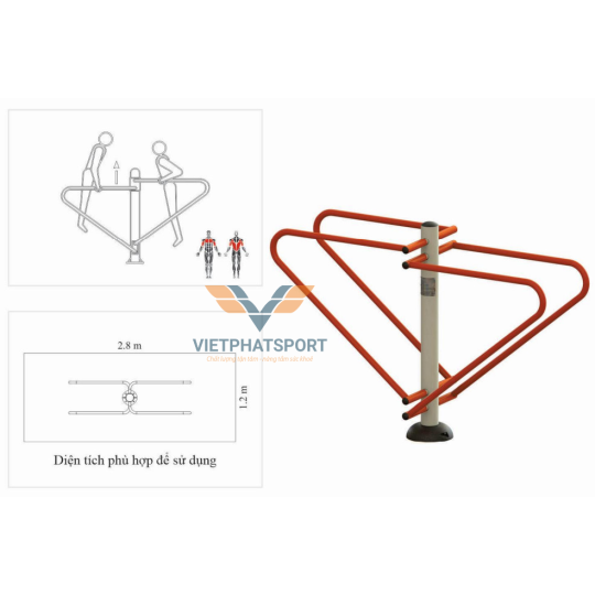 Với kích thước DxRxC là 202 x 64 x 143cm, xà kép 731144 phù hợp với nhiều không gian khác nhau, từ công viên, khu dân cư đến trường học và phòng tập. Diện tích lắp đặt phù hợp là 1.2m x 2.8m. Sản phẩm có khối lượng ước tính khoảng 56kg, đảm bảo sự chắc chắn và ổn định khi sử dụng. Tải trọng tối đa cho phép là 90kg cho mỗi vị trí tập, cho phép hai người cùng tập luyện một cách an toàn và hiệu quả.