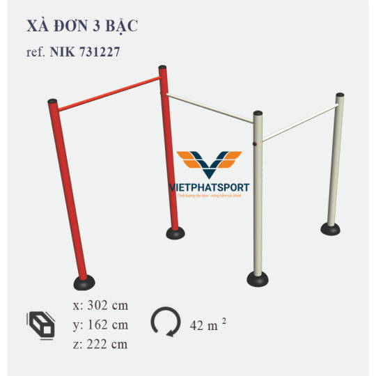 Thiết bị xà đơn 3 bậc NIK731327 là lựa chọn lý tưởng cho các trường học, khu dân cư, công viên và các khu vui chơi trẻ em. Được phân phối bởi Công ty Cổ phần Thể thao Việt Phát, sản phẩm này không chỉ đáp ứng nhu cầu vận động, rèn luyện sức khỏe mà còn đảm bảo an toàn tuyệt đối cho người sử dụng.