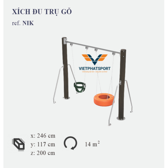 Xích đu trụ gỗ NIK734447-4 là sản phẩm lý tưởng cho các trường tiểu học, mầm non, khu dân cư, công viên và nhiều không gian vui chơi khác. Được cung cấp bởi CÔNG TY CỔ PHẦN THỂ THAO VIỆT PHÁT, sản phẩm này không chỉ đáp ứng các tiêu chuẩn an toàn khắt khe mà còn mang đến trải nghiệm vui chơi thú vị cho trẻ em.