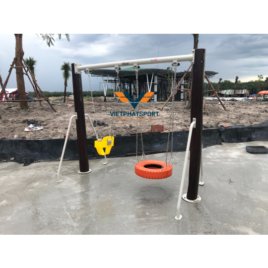 - Vật liệu chính: Trụ gỗ tự nhiên, ống thép D76, D34; dây xích inox ; Mặt ngồi nhựa tổng hợp - lốp xe.